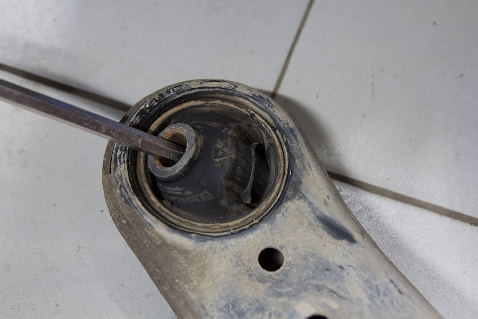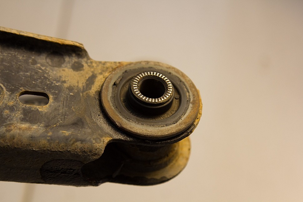 Втулка имеет повреждения. В связи с особенностью конструкции подвески и частыми артикуляциями втулки, на данной модели авто, изнашиваются неравномерно.