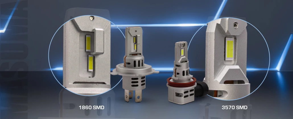 3570 SMD (двухдиодные лампы). Отличаются компактным расположением и правильной светотеневой границей, близкой к галогенной. Обеспечивает точную фокусировку и минимальное ослепление водителей встречных машин. Идеальны для ближнего света, а также ходовых огней и противотуманных фар.