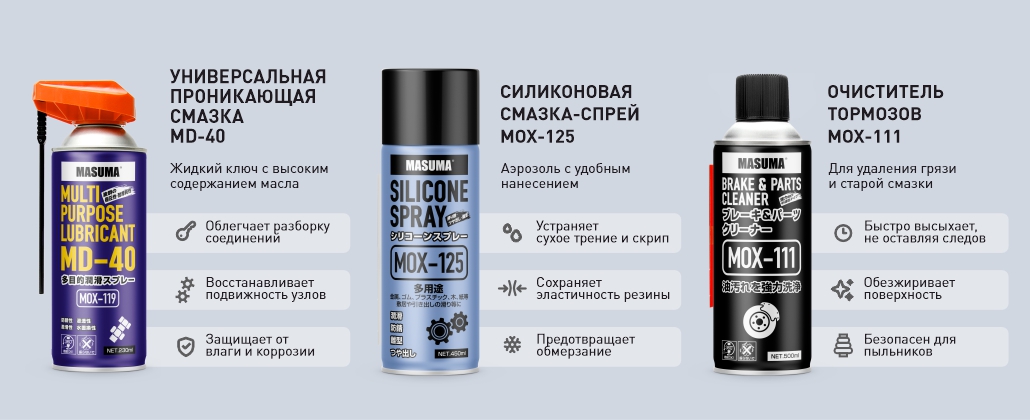 Masuma выпускает не только запчасти, но и инструменты, материалы и оборудование для авторемонта, а теперь и автохимию. Мы рады предложить автомобилистам и автосервисам качественные средства для профессионального, повседневного и бытового использования.