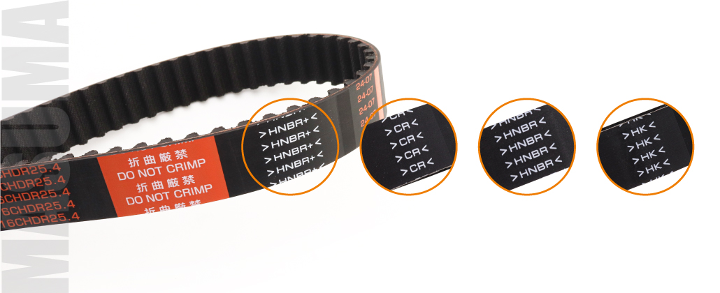 В зависимости от конструкции и температурных режимов мотора, рекомендованные ремни ГРМ Masuma изготавливаются из 4 типов материалов: CR, HNBR, HNBR+ и HK.