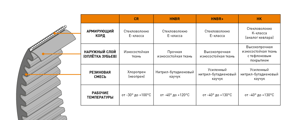 3. HNBR+ — усиленный гидрогенизированный нитрил-бутадиеновый каучук. Специальные добавки в HNBR (фторполимеры) повышают рабочую температуру ремня на 10 градусов (до 130 °C).