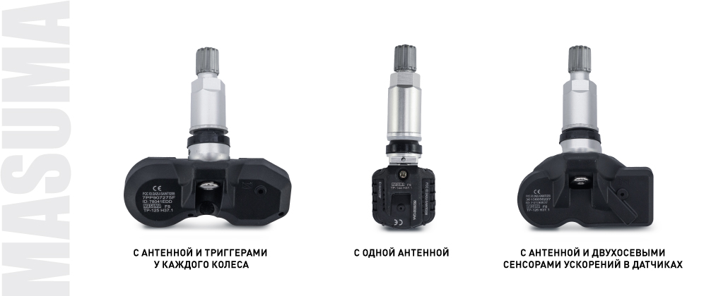Датчики Masuma для современных прямых систем контроля давления в шинах работают на наиболее распространённых частотах: 433MHz и 315MHz. В линейке представлены датчики для систем TMPS II трёх типов: