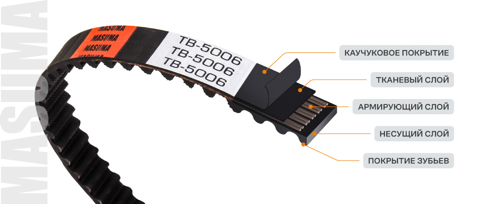В многослойной конструкции ремней ГРМ Masuma каждый слой материала выполняет свою функцию, а вместе они обеспечивают прочность и долговечность ремня.